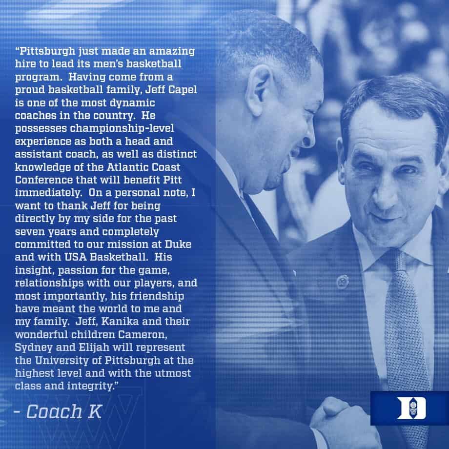 This commentary by Coach K about Coach Jeff Capel says alot about both men. Durham Cool may have a favorite in the crosstown rivalry but I can personally attest to the way Coach K behaves when the cameras are off and he is greeting fans, talking about his family and sharing a laugh with a loyal UNC fan.