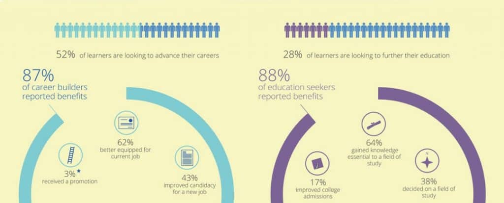 Fifty-two percent of learners said they took courses to advance their careers. Within this group, 87 percent said they enjoyed career benefits—and 33 percent say they received “tangible” benefits, defined as a raise, promotion, a new job, or starting their own business.