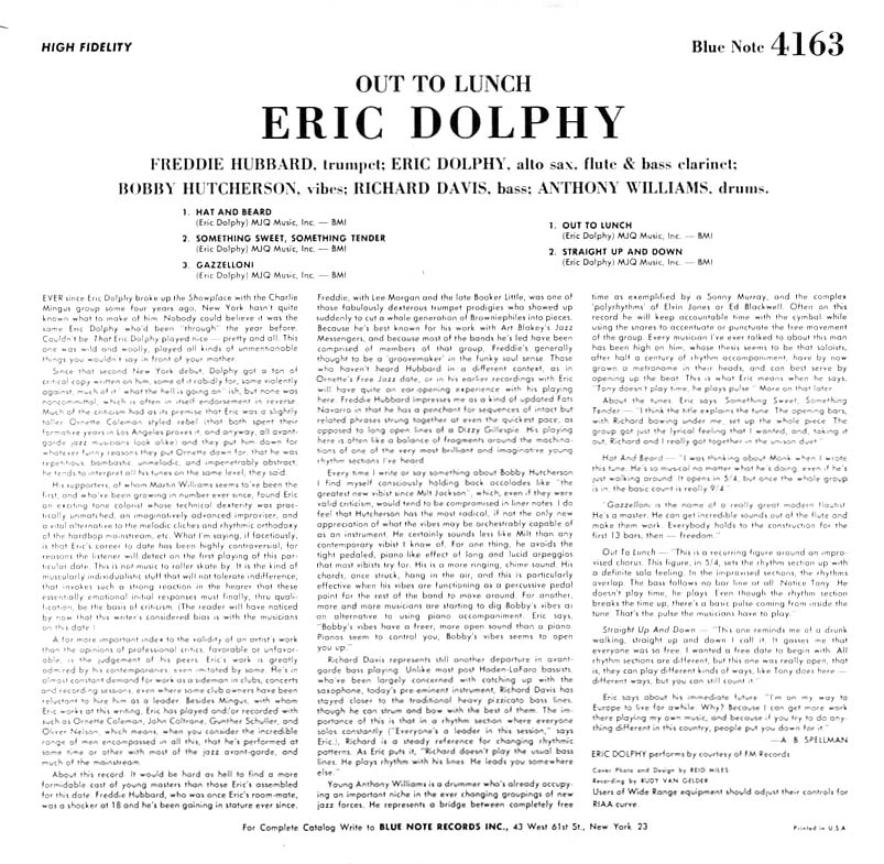 “In 1964, just four months before his sudden death in Berlin at the age of 36, Eric Dolphy recorded Out to Lunch!—an album that continues to rattle the walls of jazz orthodoxy. Released by Blue Note Records, it is the only album Dolphy made for the label, but it stands as one of the most important and uncompromising statements of the avant-garde jazz movement. Out to Lunch! is not merely ‘free jazz’ or post-bop abstraction. It is the blueprint for an entirely different approach to group interplay, improvisational space, and compositional structure.”