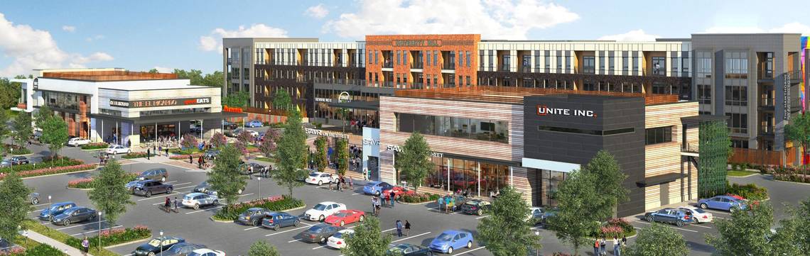 Courtesy of Hawthorne Retail Partners The project is expected to be completed in fall 2019 and will feature a 30,000-square-foot O2 Fitness athletic club as well as restaurant and office space and 269 apartments. The apartments will start around $1,150 per month and average around $1,450 per month, Hawthorne said.