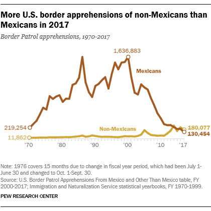 2. There were more apprehensions of non-Mexicans than Mexicans at U.S. borders in fiscal year 2017 for the third time on record (the first was in fiscal 2014). In fiscal 2017, the Border Patrol made 130,454 apprehensions of Mexicans, a sharp drop from a peak of 1.6 million apprehensions in 2000. The decline in apprehensions reflects the decrease in the number of unauthorized Mexican immigrants coming to the U.S.