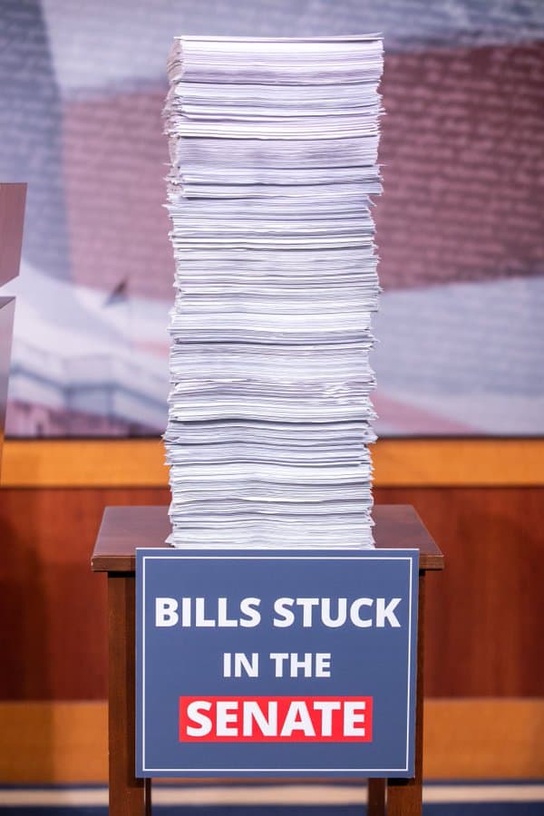 Democratic senators have been taking to social media to share photos of a pile of hundreds of bipartisan House-passed bills that still await action in the Senate as tensions continue to flare over the pace of legislation in the chamber.